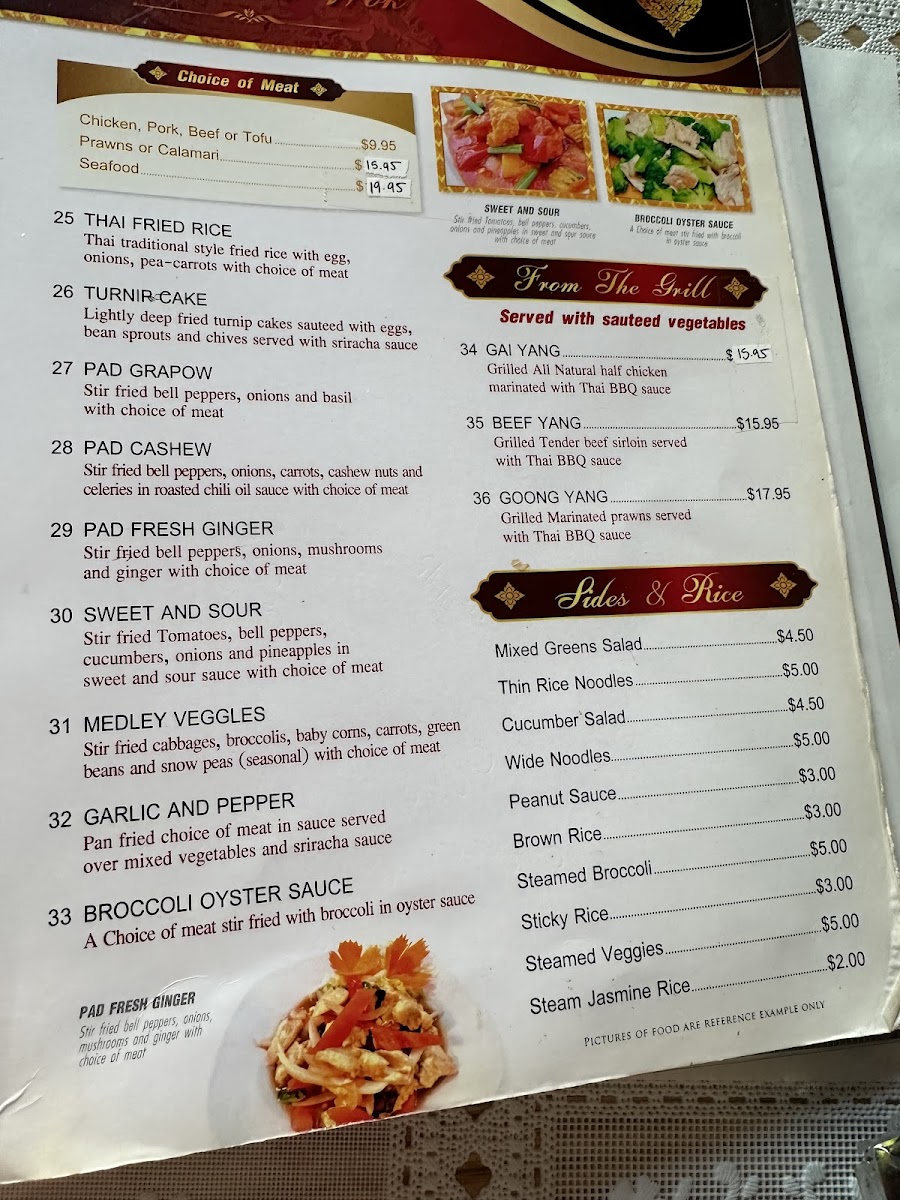 Pan-fried choice of meat in mild Thai garlic pepper sauce served with steamed vegetable & Sriracha sauce.